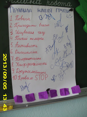 - Скажіть, як ви думаєте, чому ми працюємо у команді? Для чого це потрібно? На це питання різноманітні були отримані відповіді від учасників, але прийшли ми всі до головного, що від участі кожного залежить позитивний результат усієї команди.І кожна команда може працювати лише тоді, коли у неї є щось спільне: ідея, мрія, ціль і головне спільно прийняті правила!!!